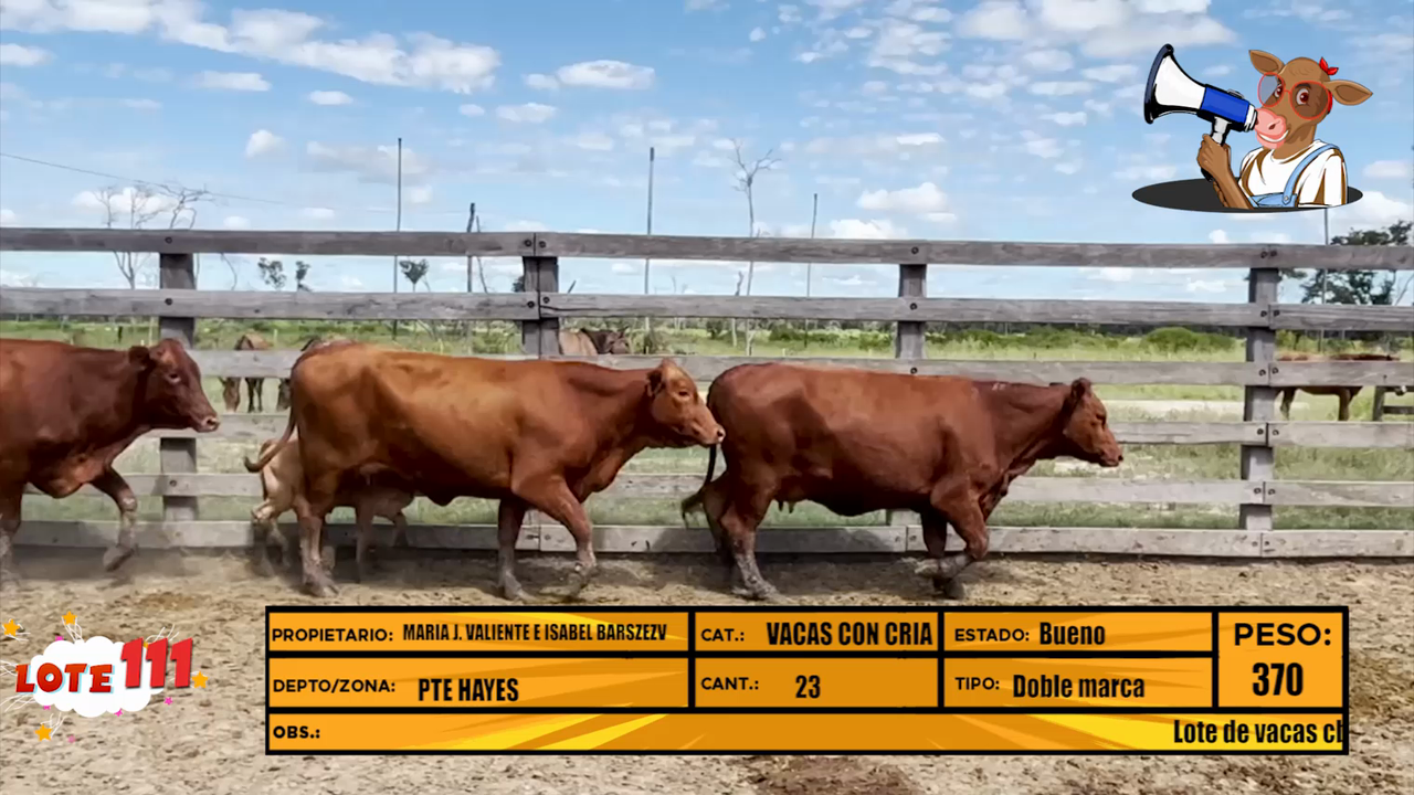 lote de vacas cbo. 1 registradas con cría productos de servicio de otoño. Los terneros tienen entre 55 a 25 dias de edad. 10 terneros cría de INVASOR y 13 de repaso de toros brangus colorados. El lote tiene dos propietarios, Maria Jose Valiente (21) y Isabel Barszez (2)